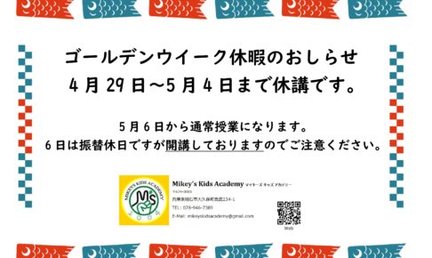 こんにちは 明石の大久保 江井ヶ島にある英会話教室 『明石大久保江井ヶ島 英会話マイキーズ』 スタッフのMariです。 10連休のレッスンですが、マイキーズは4月29日から5月4日まで休講です。 次の授業は5月6日月曜日…